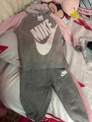 Conjunto deportivo de dos piezas para bebé. - Sudadera gris con mangas rosas y logo Nike blanco. - Pantalón gris a juego con logo Nike pequeño.