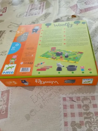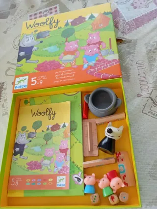Juego de mesa cooperativo Woolfy de Djeco, recomendado para niños de 5 a 9 años. Fomenta el trabajo en equipo y la estrategia. - Incluye tablero, figuras de cerditos y lobo, dados y otros componentes. - Diseño colorido y atractivo. - Ideal para partidas familiares.