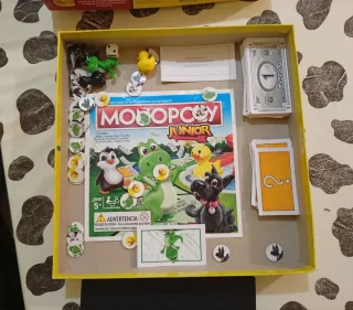 Juego de mesa Monopoly Junior, una versión divertida y simplificada del clásico Monopoly. - Ideal para los más pequeños. - Incluye tablero, peones y dinero de juego. - Diseñado para 2-4 jugadores. Lo único que tiene es un poco deteriorado un cartón que viene dentro de la caja y las instrucciones un poco gastadas.