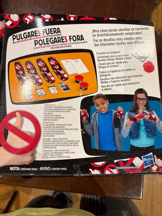 Divertido juego de mesa Pulgares Fuera de Hasbro Gaming. - Juego de desafío para jugar sin pulgares. - Incluye plastilina.( Se recomienda usar una nueva) - Muy poco uso. Todas las piezas. La plastilina conviene cambiarla. Cartas en perfecto estado