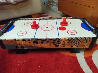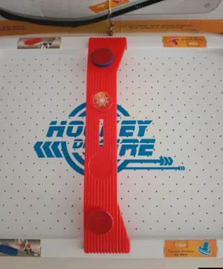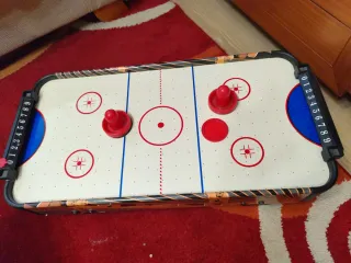 Divertida mesa de hockey de aire para jugar en casa. Ideal para pasar ratos de ocio. - Diseño con temática de jugadores de hockey. - Marcadores laterales para llevar la puntuación.