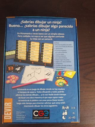 Juego de mesa Pictomania, una nueva versión del popular juego. - Diseñado por Vlaada Chvátil. - Ilustraciones de un dragón dibujando. - Incluye el logo de Devir y Czech Games Edition.