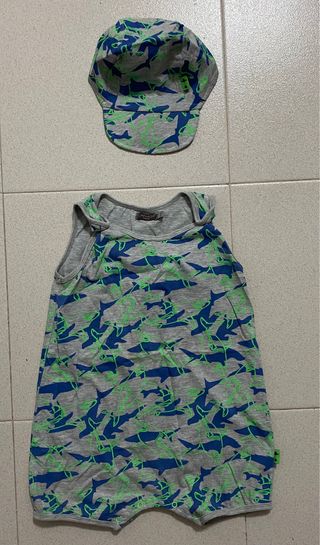 Conjunto de verano para niño de 24 meses, que incluye una gorra a juego. - Mono de tirantes con estampado de tiburones en azul y verde neón. - Gorra a juego con el mismo estampado. - Tejido de algodón suave y transpirable.