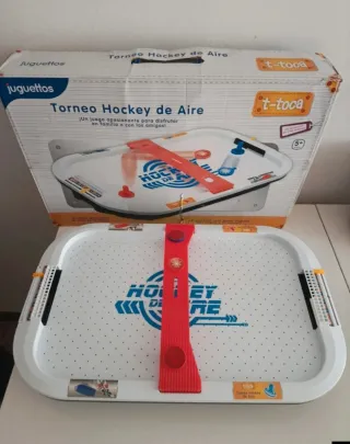 ➡️ Juego Torneo de hockey de aire de Juguettos. 🔋Funciona con 4 pilas LR6 (no incluidas). 👥 2 jugadores. 🗓️ Recomendado a partir de 5 años. 📦 Caja original algo deteriorada. 📣 Falta el disco azul. Se puede utilizar cualquier ficha de plástico, funciona igualmente.