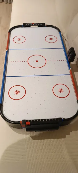 Divertida mesa de hockey de aire para jugar en casa. Ideal para niños y adultos. - Marcador manual de puntuación en cada extremo. - Diseño compacto y portátil. - 2 patas de madera para opción de montar
