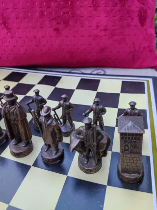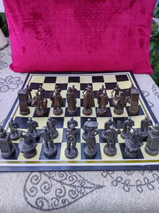 Conjunto de figuras de ajedrez de metal con un diseño detallado. - Piezas de ajedrez de metal. - Diseño de figuras históricas. - Tablero de ajedrez incluido.