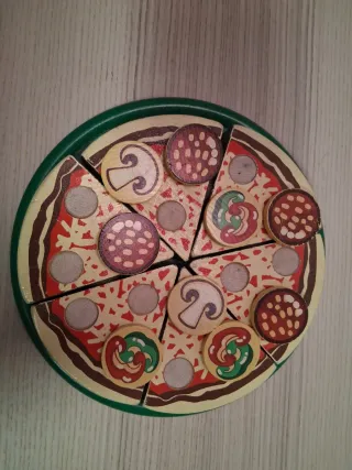 Divertido juego de mesa de pizza de madera, ideal para los más pequeños. Fomenta la creatividad y el juego. Alguno de los ingredientes tiene el dibujo un poco gastado (véase en las imágenes) - Piezas de madera con diferentes ingredientes. - Base de pizza con porciones. - Incluye fichas de pepperoni, champiñones y pimientos.