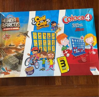 Pack de 3 juegos infantiles de la marca Falomir. Esta en muy buen estado sin usar, tan solo la caja externa está un poco abollada. - Incluye los juegos Hundir la Flota, ¿Cuál es Cuál? y Coloca 4. - Ideal para el entretenimiento y desarrollo de los más pequeños.