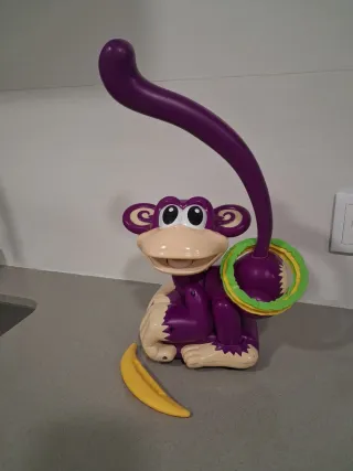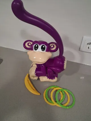 Juego Pilla al Mono Pepe con su característico mono morado y detalles en beige. Incluye un plátano amarillo y aros de colores para lanzar. Funciona con pilas.
