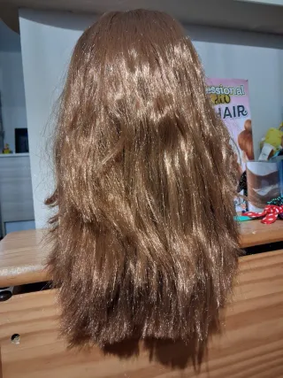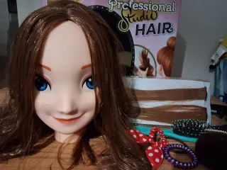 Cabeza de práctica de peluquería con cabello largo y suave, parece cabello real. Incluye varios accesorios para peinar. - Incluye extensiones de cabello. - Incluye cepillo y coleteros. - Incluye moño para el cabello. Se fij la cabeza en ma mesa