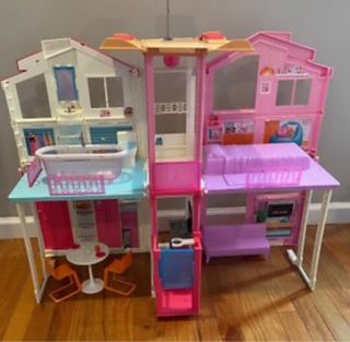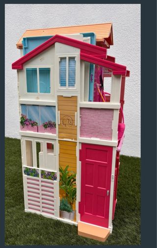 Casa de muñecas Barbie con múltiples niveles y accesorios. - Incluye ascensor funcional. - Cocina equipada con horno y nevera. - Baño con bañera. - Dormitorio con cama. - Salón con sofá y mesa. - Terraza exterior con mesa y sillas.