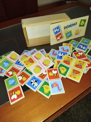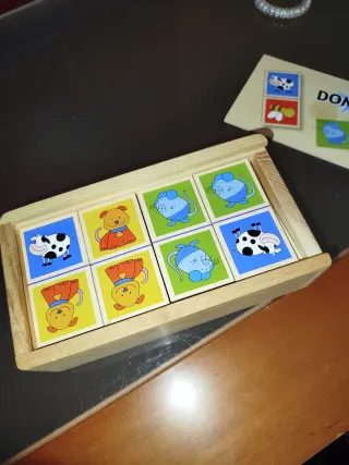 Divertido juego de mesa de dominó con divertidos dibujos de animales. - Piezas de madera con ilustraciones. - Incluye caja de madera para guardarlo. Domino infantil