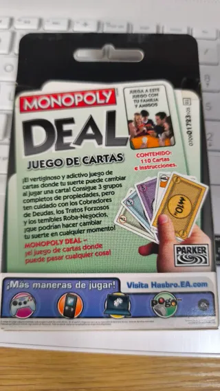 Juego de cartas Monopoly Deal PRECINTADO Juego de cartas basado en el Monopoly. DESCATALOGADO, de ahí su precio. - Precio por unidad. - Juego de cartas para 2-5 jugadores. - Edad recomendada: 8+ años. - Duración aproximada: 15 minutos. - La caja presenta marcas de desgaste pero las cartas nunca se han usado, se encuentran precintadas. - Varias unidades disponibles. .. POR MALAS EXPERIENCIAS CON INPOST SOLO RECOMIENDO ENVIOS CON CORREOS, NO ACEPTO ENVÍOS POR INPOST.