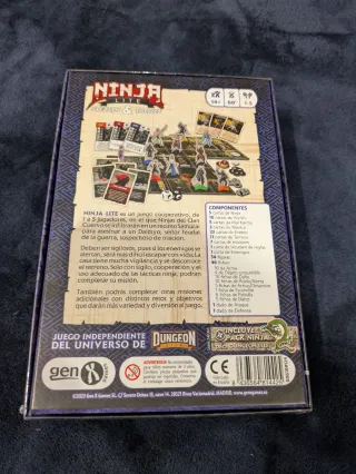 Juego de mesa Ninja Lite: Stealth & Tactics. - Juego de estrategia y sigilo. - Ilustraciones temáticas de ninjas y castillos japoneses. - Diseñado por José Marc Ruiz. -Cartas enfundadas y tokens encapsulados. - Se incluyen peanas de plastico sustituyendo las de carton. - Figuras embolsadas, no incluye cajas de plastico.
