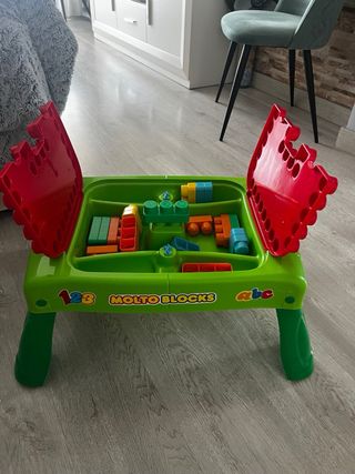 Mesa de actividad Molto Blocks con superficie para construcción. - Color verde y rojo. - Incluye bloques de construcción. - Diseño con números y letras.