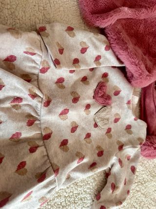 Precioso conjunto de Mayoral para bebé. - Vestido de manga larga con estampado de corazones en tonos rosa y beige. - Detalle de corazones aplicados en la parte delantera del vestido. - Chaleco a juego de pelo sintético en color rosa. - Diadema a juego con pompón.