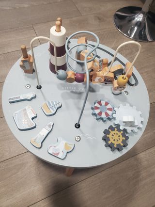 Mesa de actividades de madera para niños de la marca Little Dutch. Ideal para el desarrollo de la motricidad fina y la imaginación. - Diseño marítimo con faro y animales. - Incluye cuentas para deslizar y engranajes. - Base estable con patas de madera.