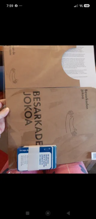 Juego de mesa Besarkaden Jokoa, conocido como El juego de los abrazos. - Incluye caja y cartas. - Diseño de caja con temática de pañuelos. - Ilustraciones coloridas en las cartas.