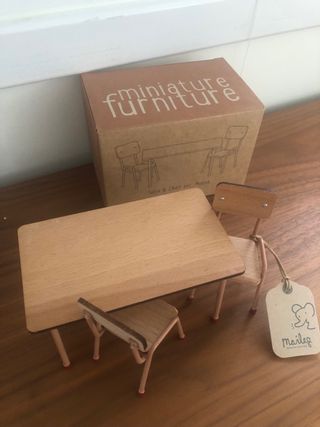 Set de mesa y dos sillas de la marca Maileg, perfecto para casas de muñecas o para los ratones de la marca. - Diseño de madera. - Incluye mesa y dos sillas. - Patas metálicas en color rosa palo. - Nuevo con etiqueta y con su caja original.