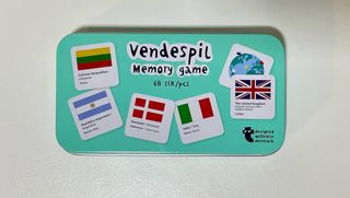 Juego de mesa Vendespil Memory Game con temática de países, banderas y capitales. Contiene 68 piezas. - Incluye tarjetas de Lituania, Argentina, Dinamarca, Italia y Reino Unido. - Diseñado en Dinamarca.