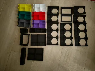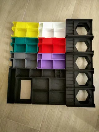 Inserto 3D para el juego de mesa High Frontier 4 All. Listo para recoger o enviar (vendo el inserto ya impreso, no es impresión bajo demanda) 19 piezas en total, las bandejas de los jugadores en su color. Está en makerworld si quieres más info. No incluye el juego