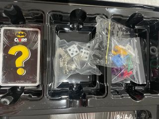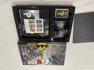 Juego de mesa Cluedo con temática de Batman. Incluye cartas y accesorios. - Cartas de Cluedo. - Dados. - Figuras de personajes.