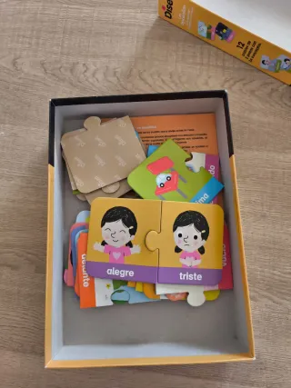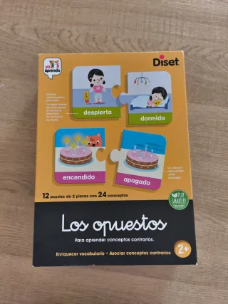 Juego educativo de Diset para aprender conceptos contrarios. - 12 puzzles de 2 piezas. - Incluye 24 conceptos. - Sistema autocorrectivo por color. - La franja interior de color ayuda a relacionar los conceptos correctos. - Recomendado para mayores de 2 años.