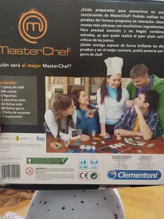 Juego de mesa oficial de MasterChef de Clementoni. Ideal para fans del programa. - Para 3-6 jugadores. - Edad recomendada: 8-99 años. Por dentro tiene las tarjetas sin abrir, la caja está algo dañada. No contiene gorro de chef