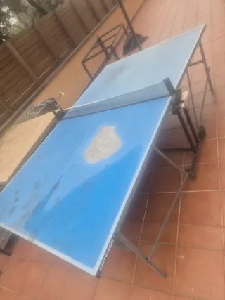 Mesa de ping pong de color azul, ideal para jugar en exteriores. La marca es Artengo. - Superficie de juego azul. - Patas metálicas plegables.