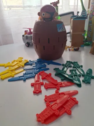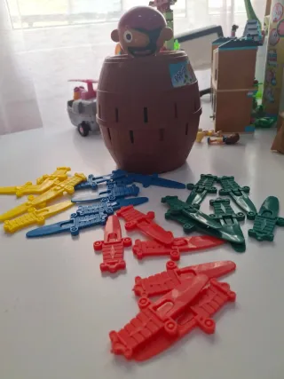 Juego clásico Salta Pirata para toda la familia. - Incluye barril de pirata. - Figuras de piratas de plástico. - Espadas de plástico de colores (rojo, azul, verde, amarillo).