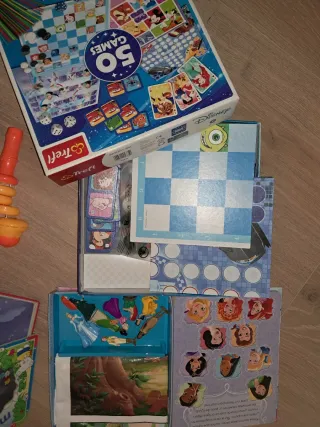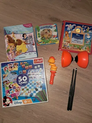 Lote de juegos y libros infantiles. - Libro Disney Princesas: Grandes Aventuras, con 8 figuritas. - Libro Michi en la montaña. - Libro Relatos de 3 Minutos: Cuentos para dormir. Está muy usado y despegado, ver foto, pero se puede usar para leer los cuentos sin problema. - Juego de mesa 50 Games de Trefl. Casi nuevo. - Diábolo naranja y palos.