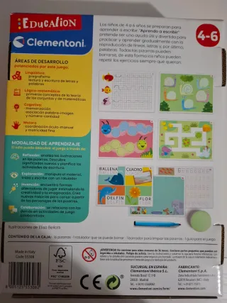 Set de aprendizaje Clementoni para que los más pequeños practiquen la escritura. Incluye pizarras reutilizables. - 16 pizarras para practicar la escritura. - Incluye rotulador y borrador. - Edad recomendada: 4-6 años. - Fabricado en Italia, pero pizarras en castellano
