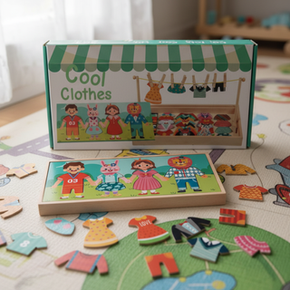 Juego de vestimenta y rompecabezas de madera, ideal para el desarrollo de habilidades motoras finas y creatividad. - Incluye figuras de personajes y diversas prendas de vestir. - Diseñado con un enfoque Montessori para el aprendizaje autónomo. - Presentación en caja NUEVOS - SIN USO #juguete #juego #puzzle #rompecabezas #juguetedemadera #montessori #regalo #juegodevestir #vestirmuñecas
