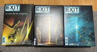 Lote de tres juegos de mesa de la serie EXIT. - EXIT: La casa de los enigmas (7€) - EXIT: El museo misterioso (7€) - EXIT: El tesoro hundido (8€) - Nivel: Principiante - Idioma: Español - Diseñadores: Inka y Markus Brand (dos de ellos con Ralph Querfurth) Se venden también por separado y también se aceptan intercambios por otros juegos de EXIT.