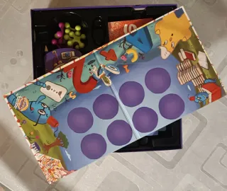 Juego de mesa Pelusas Borbotos, ideal para divertirse. - Ilustraciones coloridas y personajes adorables. - Diseñado por Reiner Knizia. - Incluye elementos en español y portugués.