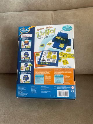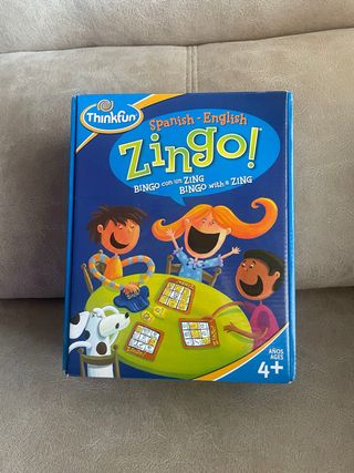 Juego de mesa educativo Spanish-English Zingo! de ThinkFun. Ideal para aprender vocabulario en español e inglés de forma divertida. - Incluye tablero, fichas y dispensador. - Diseñado para niños a partir de 4 años.
