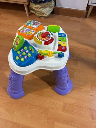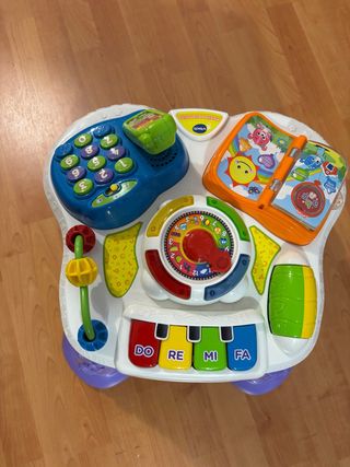 Mesa de actividades VTech para bebés con múltiples juegos. - Teléfono con números. - Libro con imágenes. - Piano con notas musicales (Do, Re, Mi, Fa). - Rueda giratoria con números y figuras. - Cuentas para deslizar.