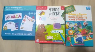 Lote de tres juegos educativos de la marca Clementoni para aprender y divertirse. - Juego de Ortografía: Asistente de Aprendizaje de Español. En perfecto estado y completo. - Juego Aprendo a Escribir: 16 pizarras para practicar la escritura. Hay que borrarlas (frotando), el rotulador pinta regular. - Juego Colores y figuras: Para aprender formas y colores. En perfecto estado y completo. El precio no es negociable, ya que he valorado los dos en buen estado y regalo el del rotulador