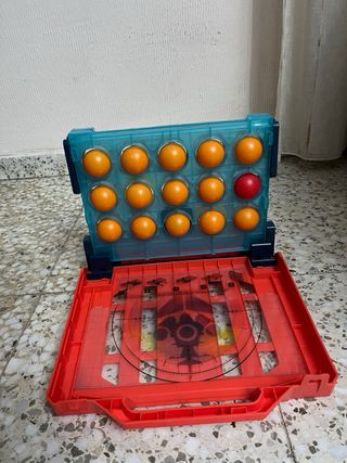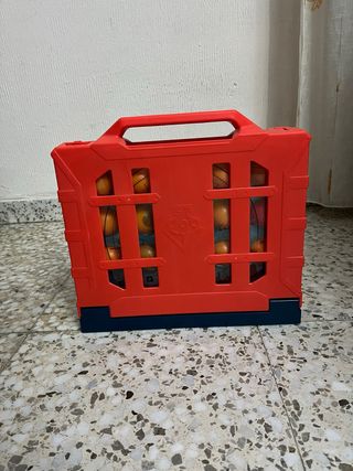 Cesta de juego para niños con varias pelotas en su interior. Consiste en “undir la flota”, pero con bolas. - Cesta de plástico rojo. - Base azul. - Incluye pelotas naranjas.