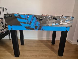 Mesa de multijuegos, furbolin, billar, pinpong....con diseño deportivo en azul y negro. Ideal para disfrutar de partidas. - Diseño con imágenes de jugadores de fútbol. - Estructura robusta con patas negras.