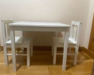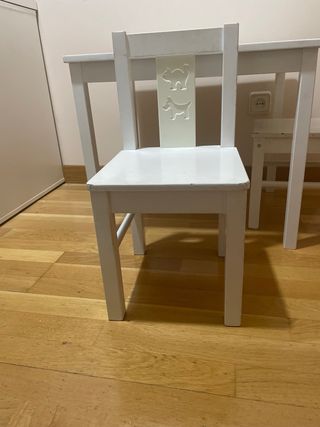Conjunto de mesa y silla infantil de madera blanca. Ideal para que los más pequeños jueguen y aprendan. - Diseño con siluetas de gato y perro en el respaldo de la silla. - Acabado liso y fácil de limpiar. Como se ve en la foto presenta algún golpecito y algo de rotulador en la mesa