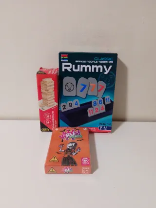 Nuevos, sin estrenar Lote de tres juegos de mesa. - Juego de fichas Rummy. - Juego de cartas Virus! Halloween. - Juego de habilidad Torre de madera (Jenga). Caja un poco dañada. - Ideal para pasar ratos divertidos en familia o con amigos.