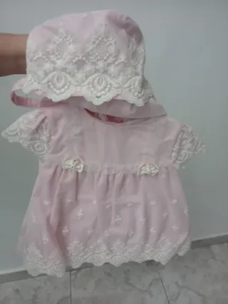 Conjunto de vestido y gorro en color rosa, ideal para bebés de 12 meses. El vestido tiene mangas cortas y detalles de encaje blanco. - Vestido con volantes y lazos. - Gorro a juego con encaje. - Adornos florales bordados en el vestido.