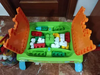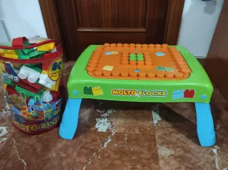 Mesa de construcción Molto Blocks con bolsa de piezas. - Mesa de construcción de plástico. - Incluye bolsa con 130 piezas. - Color verde y naranja.