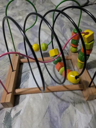 Juego de mesa de madera con cuentas de colores para bebés. Fomenta la motricidad fina y la coordinación. - Base de madera. - Alambre con cuentas de colores. - Diseño seguro para niños pequeños.
