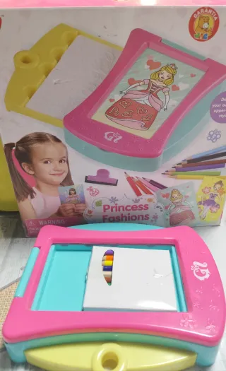 Juego de mesa para crear diseños de moda de princesas. Incluye accesorios para dibujar y colorear. - Incluye plantillas de moda. - Lápices de colores variados. - Ideal para fomentar la creatividad.
