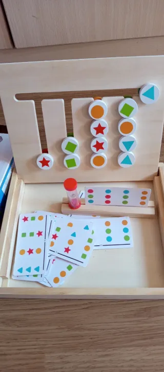 Fomenta el pensamiento lógico y la coordinación. - Incluye tablero con piezas de colores. - Tarjetas con patrones de colores y formas. - Reloj de arena para el juego.