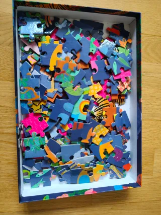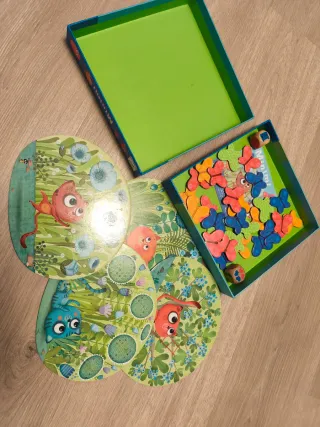 Divertido puzzle de madera con 48 piezas y un diseño de animales. - Ilustración colorida de animales en un entorno natural. - Piezas de madera resistentes. - Pequeño fallo en uno de los monos y en l acola del zorro. Se le ha levantadoel papel, pero se puede pintar de nuevo.