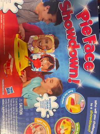 Juego de mesa Pie Face Showdown de Hasbro. ¡Prepárate para la diversión y las risas! - Incluye el juego base. - Requiere crema batida (no incluida). - Para 2 o más jugadores. - Apto para mayores de 5 años.