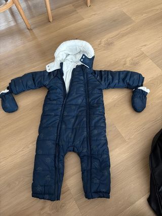 Mono de nieve para bebé, ideal para el frío. - Color azul marino con estampado de nieve muy suave y bonito. - Forro interior blanco y suave. - Dos cremalleras enteras para mayor comodidad en el cambio de pañal - Capucha con borde de pelo. - Incluye manoplas a juego.